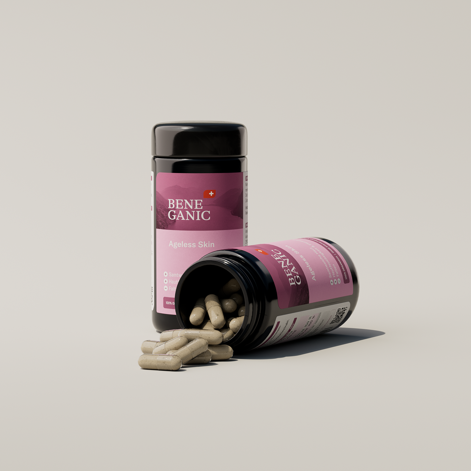 Unser Ageless Skin ist Luxus in 2 Kapseln: Hyalstar®-Hyaluronsäure, OvoDerm® Kollagen und Elastin, das Antioxidans Astaxanthin Astafit®, pflanzenbasiertes Biotin und Selen – für samtweiche Haut voller Ausstrahlung.